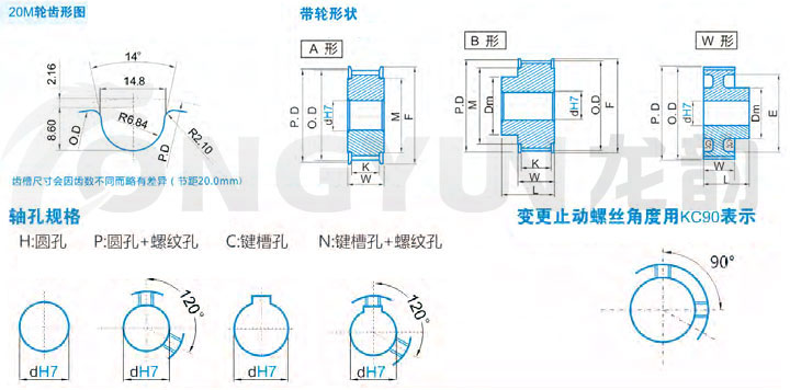 | 规格 | 形状 | 节径P.D | 外径O.D | 挡边外径F | 挡边内径M | 透孔外径E | 轮毂直径Dm | 内孔dH7 | |||