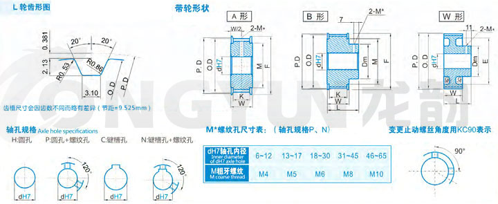 加工L同步带轮所用材质以45#钢、铝合金为主、其它还可选用铸铁、铜、尼龙等其它适合加工的材料,如有需要也可以按照您所需的材料加工。L型同步带轮表面处理有本色氧化,发黑,镀锌,镀彩锌,高频淬火等处理。精度等级依客户要求而定。