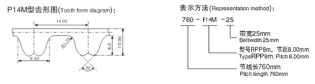 RPP14M橡胶单面齿同步带设计参数:齿形为齿型为兔牙型,转弯效果好,适合高速传动。 标准设计参考值:节距:14mm;齿高:6mm;带厚:10mm