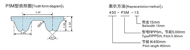 标准设计参考值:节距:5mm;齿高:1.81mm;带厚:3.6mm