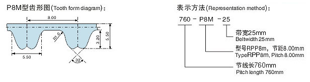 RPP8M橡胶单面齿同步带设计参数:齿形为齿型为兔牙型,转弯效果好,适合高速传动。 标准设计参考值:节距:8mm;齿高:2.90mm;带厚:5.5mm