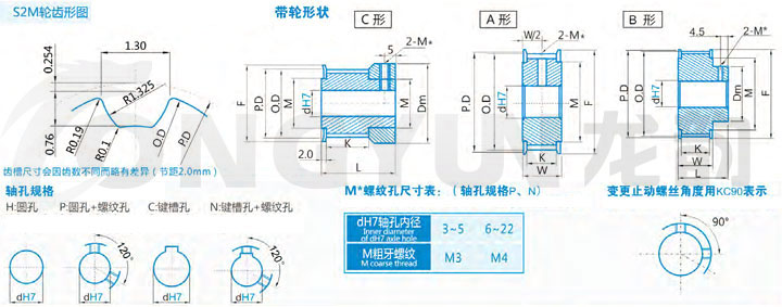 | 规格 | 形状 | 节径P.D | 外径O.D | 挡边外径F | 挡边内径M | 轮毂直径Dm | 内孔dH7 | |||||