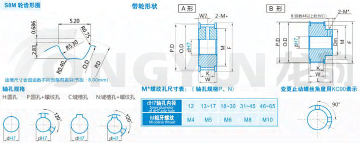 | 规格 | 形状 | 节径P.D | 外径O.D | 挡边外径F | 挡边内径M | 轮毂直径Dm | 内孔dH7 | |||||