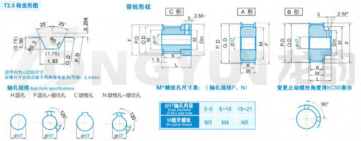 | 规格 | 形状 | 节径P.D | 外径O.D | 挡边外径F | 挡边内径M | 轮毂直径Dm | 内孔dH7 | ||||